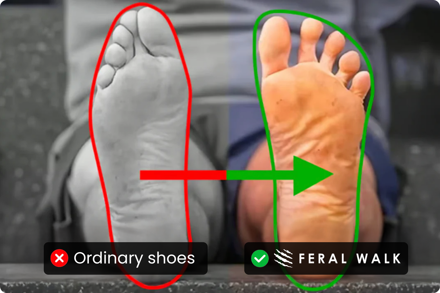 Traditional shoes weaken muscles by restricting their movement. Feral Walk stimulates over 100 muscles with every step, naturally strengthening your feet.