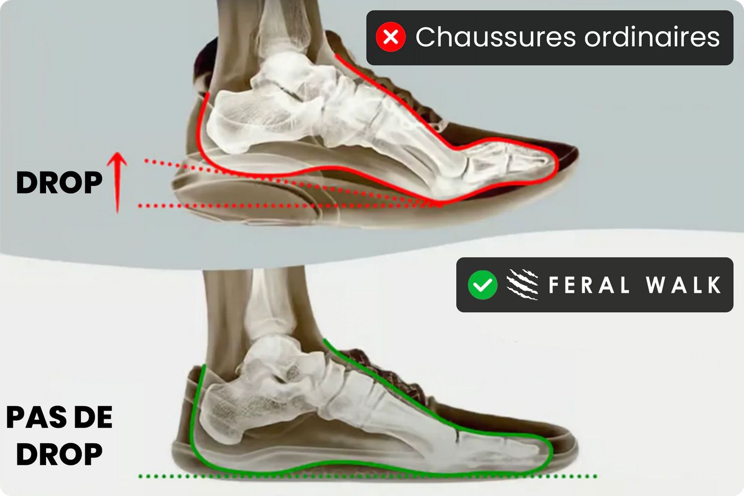 Le talon surélevé (drop) déséquilibre la posture, provoquant des tensions dans tout le corps.